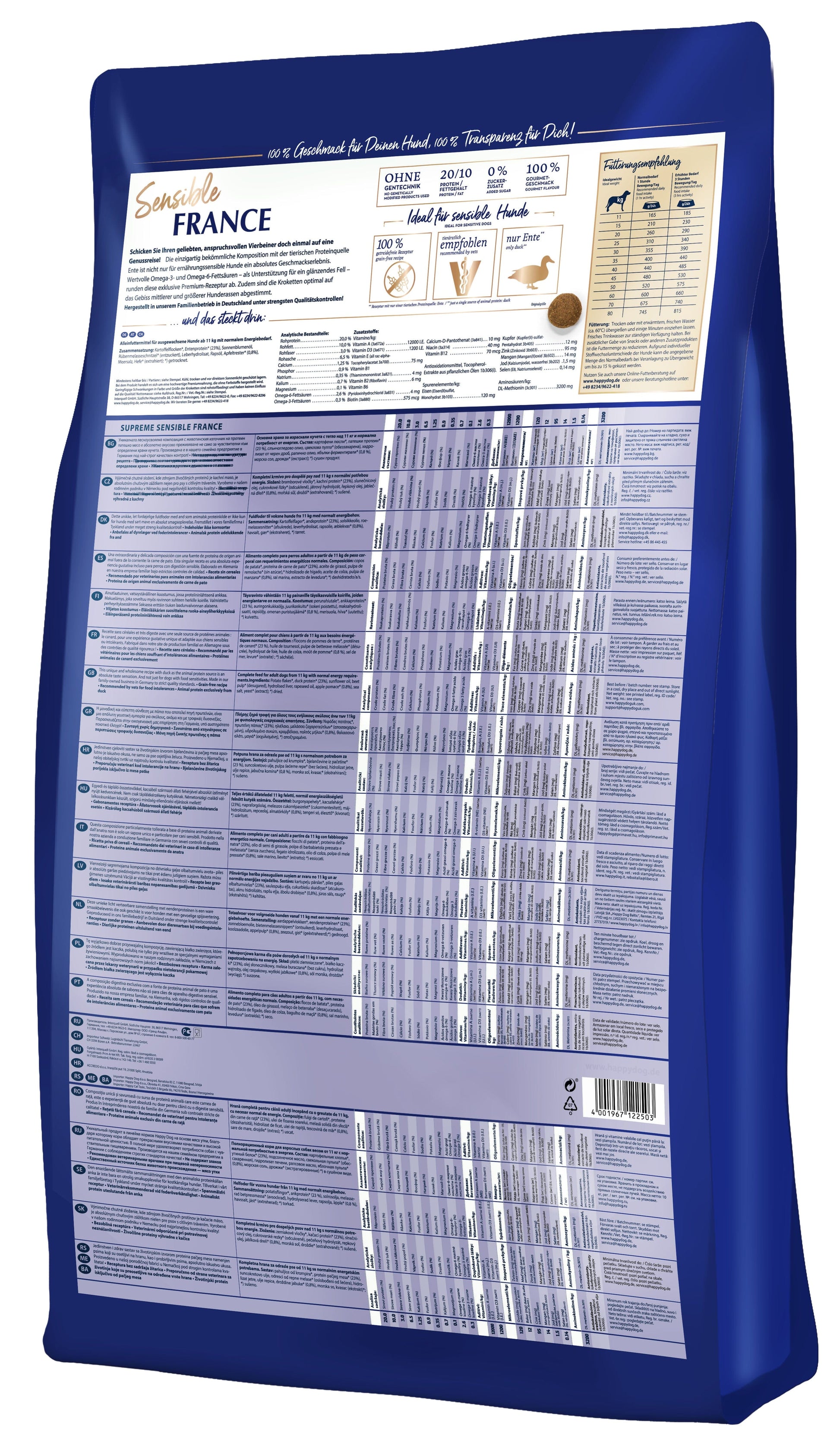 The super premium complete food Happy Dog Sensible France relies on a holistic composition of tasty duck and fine potato. The balanced recipe provides your four-legged friend with everything he needs. Delicious duck provides important animal proteins - 100% appropriate for your dog. Fine potatoes provide your fur nose with enough energy to play and run around. Valuable, essential omega-3 and -6 fatty acids ensure a beautiful, shiny coat. Our Sensible France dry food makes healthy and holistic nutrition easy. Simply open the sack, fill the bowl and your four-legged friend can really feast.